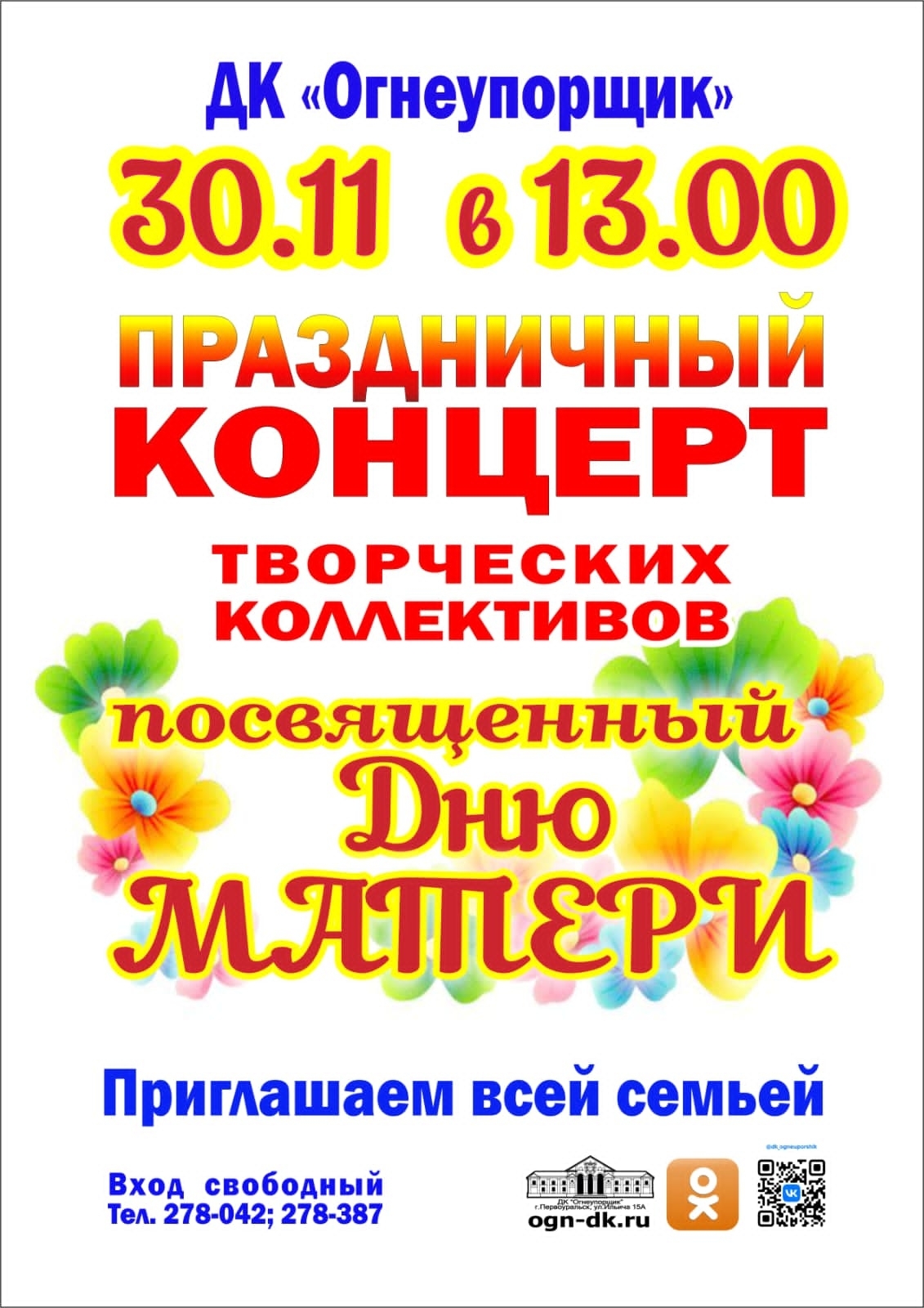 Мамы, мамочки, мамулечки, матушки! О вас можно говорить много не переставая! Для вас нужно петь, танцевать и радовать талантами! Мы, ваши дети, воспитанники и гости ДК "Огнеупорщик" хотим вам признаться в любви и сделать творческий подарок! Какой? Вы можете посмотреть в концертной программе творческих коллективов, посвящённой Дню матери! Ждём вас, любимые!🌸